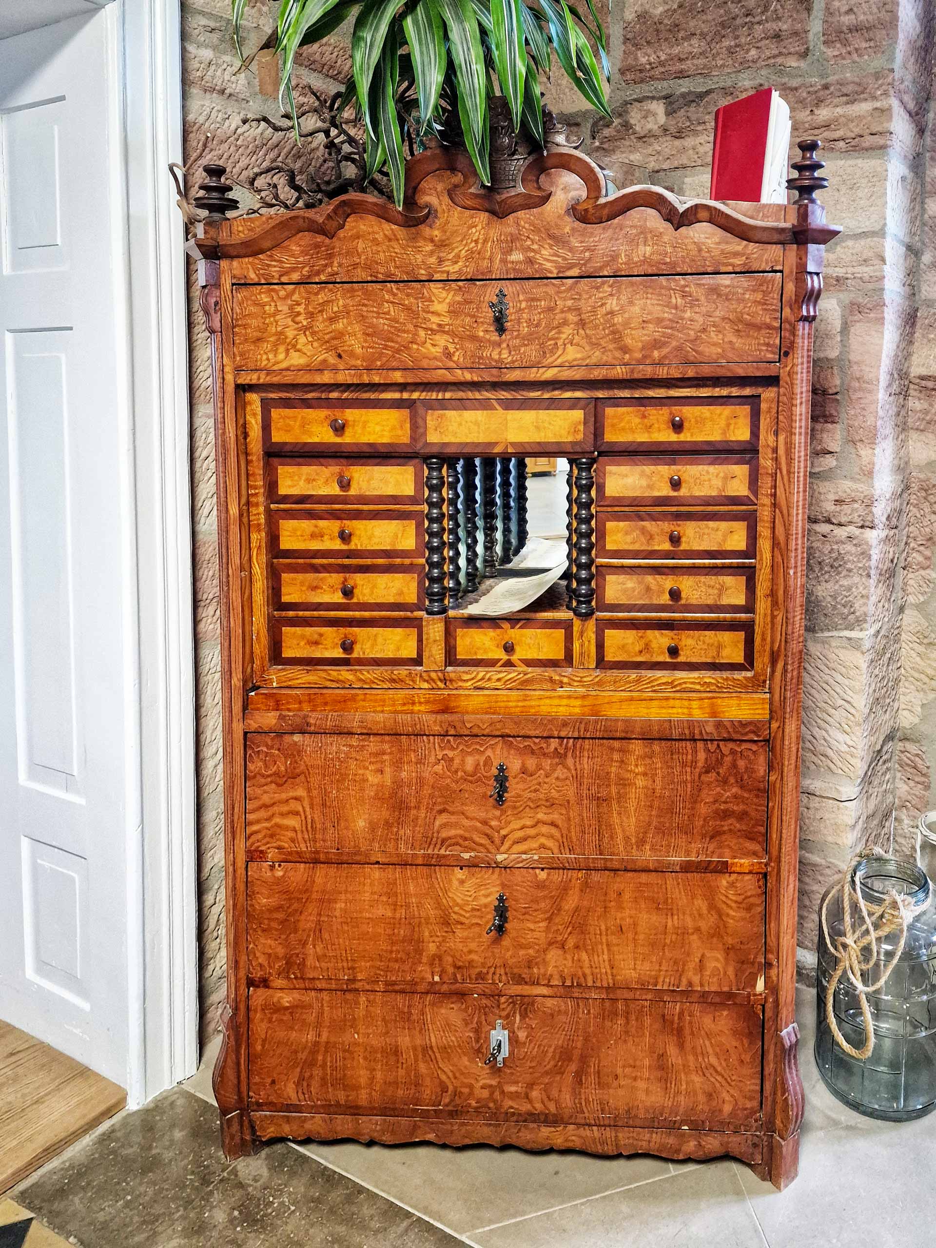 Hereinspaziert! Im Entrée unseres Gutshofs begrüßt euch ein hölzerner Zeitzeuge. Eine Kindergruppe der Franziskusschule aus Dingelstädt hat den schönen alten Schrank zusammen mit ihrer Lehrerin für uns aufbereitet. Der „geschichtsträchtige“ Mitbewohner mit seinen kleinen Schubladen beherbergt alte Bilder vom Gut, Schriftstücke und Urkunden, kleine Fundsachen und Papier, das euch einlädt, einen persönlichen Gruß zu hinterlassen. Passend zum übrigen Mobiliar im Eingangsbereich erstrahlen die Wände in restauriertem Sandstein. Diesen haben wir abgestrahlt und komplett neu verfugt – auf ganzen 450 Quadratmetern!