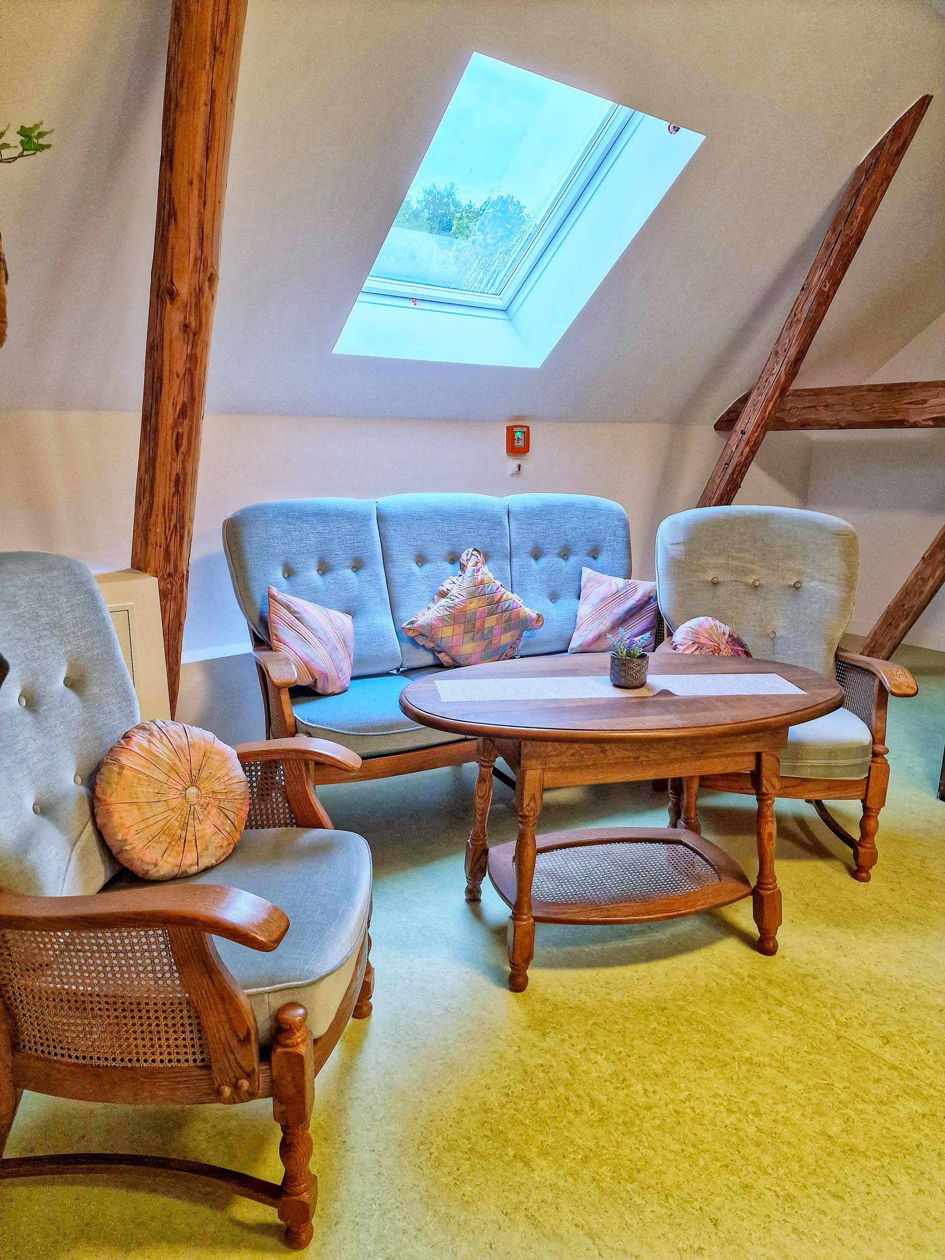 Im ersten Obergeschoss des Hauses findet ihr unsere Doppelzimmer sowie das Familienzimmer „Kella“. Auch ein kleiner Frühstücksraum und Büros sind hier angeordnet. Treppauf begrüßt euch eine blaue Sitzgruppe neben einer dunklen Bodentreppe und grünem Designboden. Umrahmt von Fachwerkelementen lädt der lichterfüllte Raum zum Entspannen und zum Austausch ein. Von hier aus geht es in unsere größeren Zimmer. Sie sind zum Teil mit Betten ausgestattet, in denen es sich schläft wie zu Urgroßmutters Zeiten. Tatsächlich stammen einige der Bettrahmen nicht aus unserem Jahrhundert. Warum auch nicht? Was früher gut war, findet so auch heute eine sinnvolle Verwendung.