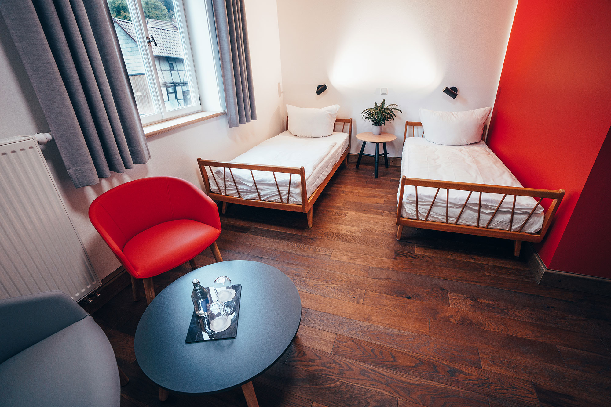 „Pfaffschwende“ strahlt in einem Rot, das wir den Farben des Ortswappens entlehnt haben. Die Betten im Retro-Style erinnern an die 60er-Jahre und wurden mit offenen, würfelartig gestalteten Regalelementen eines Möbelbauers aus der Region kombiniert – so entsteht ein modernes Ambiente mit Charme und Stil.