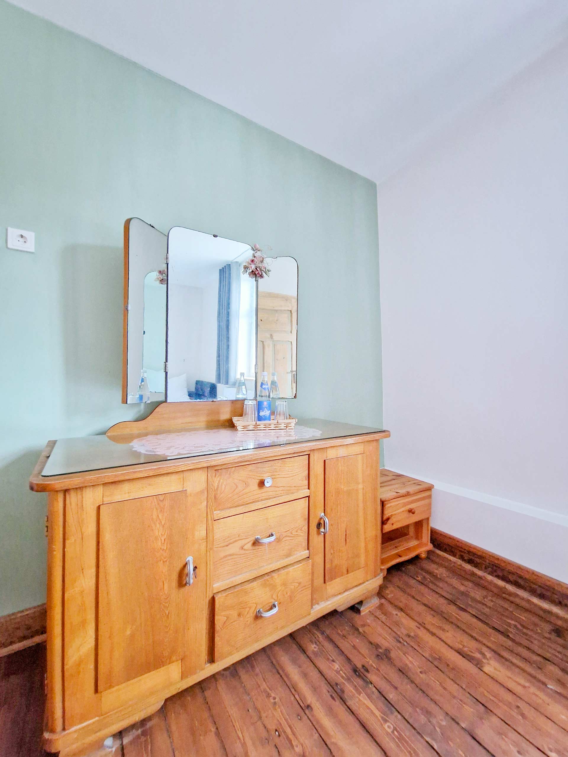 In Urgroßmutters Doppelbett schläft es sich in „Aue“ wie vor 100 Jahren – selbstverständlich gilt das nur für den Rahmen, den unser Tischler für euch wieder auf Hochglanz poliert hat. Namensgeber des Zimmers ist das kleine Dörfchen in unserer Nähe, in dessen Richtung auch der Blick aus dem Fenster fällt. Hier haben wir vier Betten verteilt auf zwei Räume für euch aufgeschüttelt.